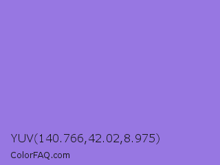 YUV 140.766,42.02,8.975 Color is a light indigo color and the nearest color is Medium Purple #9370db. Hex code #9777e2 and RGB value is rgb(151,119,226). In RGB color space, this color is composed of 59% red, 47% green, 89% blue, In CMYK color space, this color is composed of 33% cyan, 47% magenta, 0% yellow , 11% black , In HSL color space, this color has a hue angle of 258° , 65% saturation and 68% lightness.