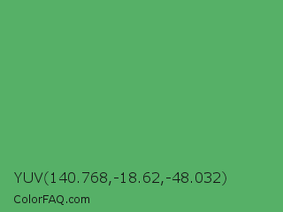 YUV 140.768,-18.62,-48.032 Color is a normal green color and the nearest color is Fern #63b76c. Hex code #56b067 and RGB value is rgb(86,176,103). In RGB color space, this color is composed of 34% red, 69% green, 40% blue, In CMYK color space, this color is composed of 51% cyan, 0% magenta, 41% yellow , 31% black , In HSL color space, this color has a hue angle of 131° , 36% saturation and 51% lightness.