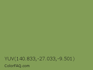 YUV 140.833,-27.033,-9.501 Color is a normal green color and the nearest color is Asparagus Green #7ba05b. Hex code #829d56 and RGB value is rgb(130,157,86). In RGB color space, this color is composed of 51% red, 62% green, 34% blue, In CMYK color space, this color is composed of 17% cyan, 0% magenta, 45% yellow , 38% black , In HSL color space, this color has a hue angle of 83° , 29% saturation and 48% lightness.