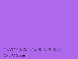 YUV 140.864,46.902,29.937 Color is a light purple color and the nearest color is Lavender #b57edc. Hex code #af69ec and RGB value is rgb(175,105,236). In RGB color space, this color is composed of 69% red, 41% green, 93% blue, In CMYK color space, this color is composed of 26% cyan, 56% magenta, 0% yellow , 7% black , In HSL color space, this color has a hue angle of 272° , 78% saturation and 67% lightness.