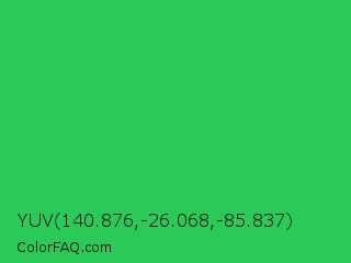 YUV 140.876,-26.068,-85.837 Color is a normal green color and the nearest color is UFO Green #3cd070. Hex code #2bc958 and RGB value is rgb(43,201,88). In RGB color space, this color is composed of 17% red, 79% green, 35% blue, In CMYK color space, this color is composed of 79% cyan, 0% magenta, 56% yellow , 21% black , In HSL color space, this color has a hue angle of 137° , 65% saturation and 48% lightness.