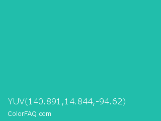 YUV 140.891,14.844,-94.62 Color is a normal cyan color and the nearest color is Light Sea Green #20b2aa. Hex code #21beab and RGB value is rgb(33,190,171). In RGB color space, this color is composed of 13% red, 75% green, 67% blue, In CMYK color space, this color is composed of 83% cyan, 0% magenta, 10% yellow , 25% black , In HSL color space, this color has a hue angle of 173° , 70% saturation and 44% lightness.