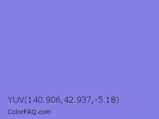 YUV 140.906,42.937,-5.18 Color is a light indigo color and the nearest color is Chetwode Blue #8581d9. Hex code #877fe4 and RGB value is rgb(135,127,228). In RGB color space, this color is composed of 53% red, 50% green, 89% blue, In CMYK color space, this color is composed of 41% cyan, 44% magenta, 0% yellow , 11% black , In HSL color space, this color has a hue angle of 245° , 65% saturation and 70% lightness.