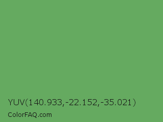 YUV 140.933,-22.152,-35.021 Color is a normal green color and the nearest color is Fern #63b76c. Hex code #65aa60 and RGB value is rgb(101,170,96). In RGB color space, this color is composed of 40% red, 67% green, 38% blue, In CMYK color space, this color is composed of 41% cyan, 0% magenta, 44% yellow , 33% black , In HSL color space, this color has a hue angle of 116° , 30% saturation and 52% lightness.