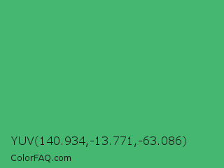 YUV 140.934,-13.771,-63.086 Color is a normal green color and the nearest color is Medium Sea Green #3cb371. Hex code #45b771 and RGB value is rgb(69,183,113). In RGB color space, this color is composed of 27% red, 72% green, 44% blue, In CMYK color space, this color is composed of 62% cyan, 0% magenta, 38% yellow , 28% black , In HSL color space, this color has a hue angle of 143° , 45% saturation and 49% lightness.