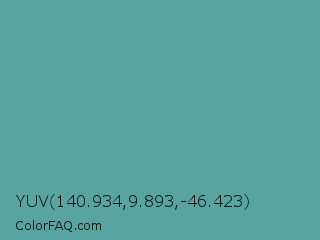 YUV 140.934,9.893,-46.423 Color is a normal cyan color and the nearest color is Breaker Bay #5da19f. Hex code #58a4a1 and RGB value is rgb(88,164,161). In RGB color space, this color is composed of 35% red, 64% green, 63% blue, In CMYK color space, this color is composed of 46% cyan, 0% magenta, 2% yellow , 36% black , In HSL color space, this color has a hue angle of 178° , 30% saturation and 49% lightness.