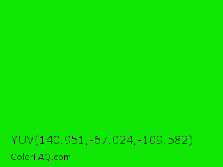 YUV 140.951,-67.024,-109.582 Color is a normal green color and the nearest color is Green #00ff00. Hex code #10e705 and RGB value is rgb(16,231,5). In RGB color space, this color is composed of 6% red, 91% green, 2% blue, In CMYK color space, this color is composed of 93% cyan, 0% magenta, 98% yellow , 9% black , In HSL color space, this color has a hue angle of 117° , 96% saturation and 46% lightness.
