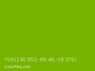 YUV 140.953,-69.49,-18.376 Color is a normal green color and the nearest color is Apple Green #8db600. Hex code #78b300 and RGB value is rgb(120,179,-0). In RGB color space, this color is composed of 47% red, 70% green, 0% blue, In CMYK color space, this color is composed of 33% cyan, 0% magenta, 100% yellow , 30% black , In HSL color space, this color has a hue angle of 80° , 100% saturation and 35% lightness.