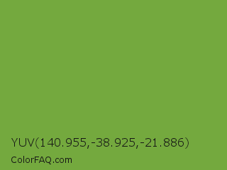 YUV 140.955,-38.925,-21.886 Color is a normal green color and the nearest color is Palm Leaf #6f9940. Hex code #74a93e and RGB value is rgb(116,169,62). In RGB color space, this color is composed of 45% red, 66% green, 24% blue, In CMYK color space, this color is composed of 31% cyan, 0% magenta, 63% yellow , 34% black , In HSL color space, this color has a hue angle of 90° , 46% saturation and 45% lightness.