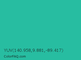 YUV 140.958,9.881,-89.417 Color is a normal cyan color and the nearest color is Light Sea Green #20b2aa. Hex code #27bda1 and RGB value is rgb(39,189,161). In RGB color space, this color is composed of 15% red, 74% green, 63% blue, In CMYK color space, this color is composed of 79% cyan, 0% magenta, 15% yellow , 26% black , In HSL color space, this color has a hue angle of 169° , 66% saturation and 45% lightness.