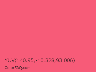 YUV 140.95,-10.328,93.006 Color is a light red color and the nearest color is Wild Watermelon #fd5b78. Hex code #f75b78 and RGB value is rgb(247,91,120). In RGB color space, this color is composed of 97% red, 36% green, 47% blue, In CMYK color space, this color is composed of 0% cyan, 63% magenta, 51% yellow , 3% black , In HSL color space, this color has a hue angle of 349° , 91% saturation and 66% lightness.