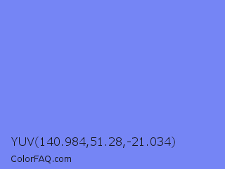 YUV 140.984,51.28,-21.034 Color is a light blue color and the nearest color is Cornflower Blue #6495ed. Hex code #7585f5 and RGB value is rgb(117,133,245). In RGB color space, this color is composed of 46% red, 52% green, 96% blue, In CMYK color space, this color is composed of 52% cyan, 46% magenta, 0% yellow , 4% black , In HSL color space, this color has a hue angle of 233° , 86% saturation and 71% lightness.