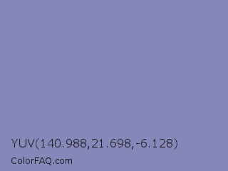 YUV 140.988,21.698,-6.128 Color is a light blue color and the nearest color is Wild Blue Yonder #7a89b8. Hex code #8688b9 and RGB value is rgb(134,136,185). In RGB color space, this color is composed of 53% red, 53% green, 73% blue, In CMYK color space, this color is composed of 28% cyan, 26% magenta, 0% yellow , 27% black , In HSL color space, this color has a hue angle of 238° , 27% saturation and 63% lightness.