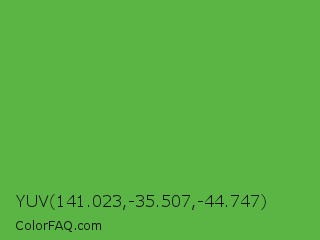 YUV 141.023,-35.507,-44.747 Color is a normal green color and the nearest color is Apple #4fa83d. Hex code #5ab545 and RGB value is rgb(90,181,69). In RGB color space, this color is composed of 35% red, 71% green, 27% blue, In CMYK color space, this color is composed of 50% cyan, 0% magenta, 62% yellow , 29% black , In HSL color space, this color has a hue angle of 109° , 45% saturation and 49% lightness.