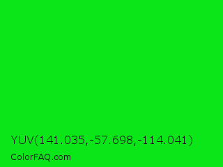 YUV 141.035,-57.698,-114.041 Color is a normal green color and the nearest color is Green #00ff00. Hex code #0be618 and RGB value is rgb(11,230,24). In RGB color space, this color is composed of 4% red, 90% green, 9% blue, In CMYK color space, this color is composed of 95% cyan, 0% magenta, 90% yellow , 10% black , In HSL color space, this color has a hue angle of 124° , 91% saturation and 47% lightness.