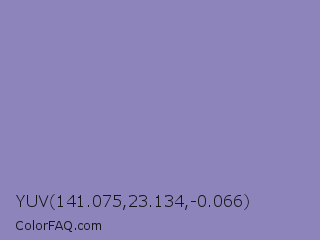 YUV 141.075,23.134,-0.066 Color is a light indigo color and the nearest color is Lavender Purple #967bb6. Hex code #8d84bc and RGB value is rgb(141,132,188). In RGB color space, this color is composed of 55% red, 52% green, 74% blue, In CMYK color space, this color is composed of 25% cyan, 30% magenta, 0% yellow , 26% black , In HSL color space, this color has a hue angle of 250° , 29% saturation and 63% lightness.