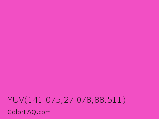 YUV 141.075,27.078,88.511 Color is a light magenta color and the nearest color is Light Deep Pink #ff5ccd. Hex code #f24fc4 and RGB value is rgb(242,79,196). In RGB color space, this color is composed of 95% red, 31% green, 77% blue, In CMYK color space, this color is composed of 0% cyan, 67% magenta, 19% yellow , 5% black , In HSL color space, this color has a hue angle of 317° , 86% saturation and 63% lightness.