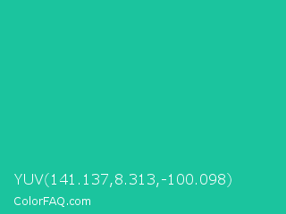 YUV 141.137,8.313,-100.098 Color is a normal cyan color and the nearest color is Light Sea Green #20b2aa. Hex code #1bc49e and RGB value is rgb(27,196,158). In RGB color space, this color is composed of 11% red, 77% green, 62% blue, In CMYK color space, this color is composed of 86% cyan, 0% magenta, 19% yellow , 23% black , In HSL color space, this color has a hue angle of 167° , 76% saturation and 44% lightness.