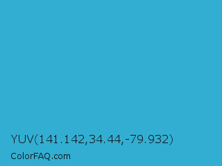 YUV 141.142,34.44,-79.932 Color is a normal blue color and the nearest color is Scooter #2ebfd4. Hex code #32aed3 and RGB value is rgb(50,174,211). In RGB color space, this color is composed of 20% red, 68% green, 83% blue, In CMYK color space, this color is composed of 76% cyan, 18% magenta, 0% yellow , 17% black , In HSL color space, this color has a hue angle of 194° , 65% saturation and 51% lightness.