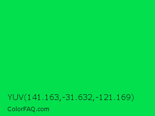 YUV 141.163,-31.632,-121.169 Color is a normal green color and the nearest color is Malachite #0bda51. Hex code #03e04d and RGB value is rgb(3,224,77). In RGB color space, this color is composed of 1% red, 88% green, 30% blue, In CMYK color space, this color is composed of 99% cyan, 0% magenta, 66% yellow , 12% black , In HSL color space, this color has a hue angle of 140° , 97% saturation and 45% lightness.