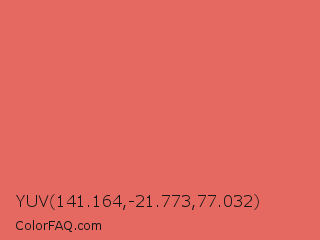 YUV 141.164,-21.773,77.032 Color is a light red color and the nearest color is Sunglo #e16865. Hex code #e56961 and RGB value is rgb(229,105,97). In RGB color space, this color is composed of 90% red, 41% green, 38% blue, In CMYK color space, this color is composed of 0% cyan, 54% magenta, 58% yellow , 10% black , In HSL color space, this color has a hue angle of 4° , 72% saturation and 64% lightness.