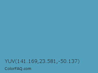 YUV 141.169,23.581,-50.137 Color is a normal blue color and the nearest color is Hippie Blue #589aaf. Hex code #54a1bd and RGB value is rgb(84,161,189). In RGB color space, this color is composed of 33% red, 63% green, 74% blue, In CMYK color space, this color is composed of 56% cyan, 15% magenta, 0% yellow , 26% black , In HSL color space, this color has a hue angle of 196° , 44% saturation and 54% lightness.