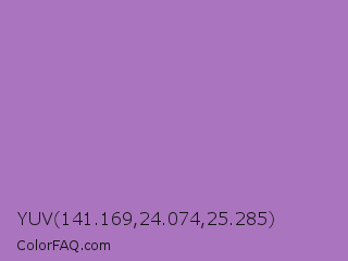YUV 141.169,24.074,25.285 Color is a normal purple color and the nearest color is African Violet #b284be. Hex code #aa75be and RGB value is rgb(170,117,190). In RGB color space, this color is composed of 67% red, 46% green, 75% blue, In CMYK color space, this color is composed of 11% cyan, 38% magenta, 0% yellow , 25% black , In HSL color space, this color has a hue angle of 284° , 36% saturation and 60% lightness.