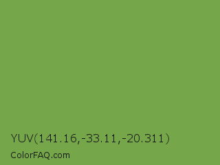 YUV 141.16,-33.11,-20.311 Color is a normal green color and the nearest color is Palm Leaf #6f9940. Hex code #76a64a and RGB value is rgb(118,166,74). In RGB color space, this color is composed of 46% red, 65% green, 29% blue, In CMYK color space, this color is composed of 29% cyan, 0% magenta, 55% yellow , 35% black , In HSL color space, this color has a hue angle of 91° , 38% saturation and 47% lightness.