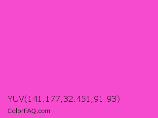 YUV 141.177,32.451,91.93 Color is a light magenta color and the nearest color is Purple Pizzazz #fe4eda. Hex code #f64bcf and RGB value is rgb(246,75,207). In RGB color space, this color is composed of 96% red, 29% green, 81% blue, In CMYK color space, this color is composed of 0% cyan, 70% magenta, 16% yellow , 4% black , In HSL color space, this color has a hue angle of 314° , 90% saturation and 63% lightness.