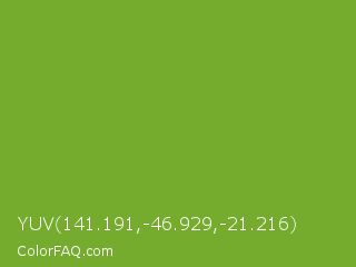 YUV 141.191,-46.929,-21.216 Color is a normal green color and the nearest color is Green RYB #66b032. Hex code #75ac2e and RGB value is rgb(117,172,46). In RGB color space, this color is composed of 46% red, 67% green, 18% blue, In CMYK color space, this color is composed of 32% cyan, 0% magenta, 73% yellow , 33% black , In HSL color space, this color has a hue angle of 86° , 58% saturation and 43% lightness.