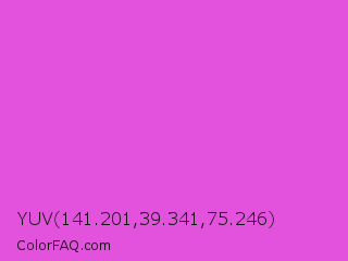 YUV 141.201,39.341,75.246 Color is a light magenta color and the nearest color is Purple Pizzazz #fe4eda. Hex code #e352dd and RGB value is rgb(227,82,221). In RGB color space, this color is composed of 89% red, 32% green, 87% blue, In CMYK color space, this color is composed of 0% cyan, 64% magenta, 3% yellow , 11% black , In HSL color space, this color has a hue angle of 302° , 72% saturation and 61% lightness.