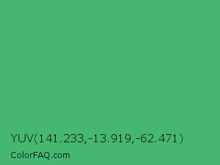 YUV 141.233,-13.919,-62.471 Color is a normal green color and the nearest color is Medium Sea Green #3cb371. Hex code #46b771 and RGB value is rgb(70,183,113). In RGB color space, this color is composed of 27% red, 72% green, 44% blue, In CMYK color space, this color is composed of 62% cyan, 0% magenta, 38% yellow , 28% black , In HSL color space, this color has a hue angle of 143° , 45% saturation and 50% lightness.