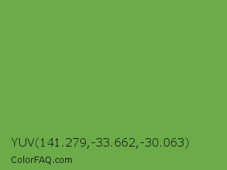 YUV 141.279,-33.662,-30.063 Color is a normal green color and the nearest color is Palm Leaf #6f9940. Hex code #6bac49 and RGB value is rgb(107,172,73). In RGB color space, this color is composed of 42% red, 67% green, 29% blue, In CMYK color space, this color is composed of 38% cyan, 0% magenta, 58% yellow , 33% black , In HSL color space, this color has a hue angle of 99° , 40% saturation and 48% lightness.