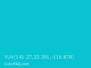 YUV 141.27,33.391,-116.878 Color is a normal cyan color and the nearest color is Turquoise Surf #00c5cd. Hex code #08c4d1 and RGB value is rgb(8,196,209). In RGB color space, this color is composed of 3% red, 77% green, 82% blue, In CMYK color space, this color is composed of 96% cyan, 6% magenta, 0% yellow , 18% black , In HSL color space, this color has a hue angle of 184° , 93% saturation and 43% lightness.