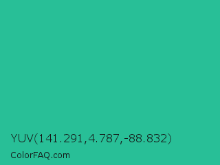 YUV 141.291,4.787,-88.832 Color is a normal cyan color and the nearest color is Mountain Meadow #30ba8f. Hex code #28bf97 and RGB value is rgb(40,191,151). In RGB color space, this color is composed of 16% red, 75% green, 59% blue, In CMYK color space, this color is composed of 79% cyan, 0% magenta, 21% yellow , 25% black , In HSL color space, this color has a hue angle of 164° , 65% saturation and 45% lightness.