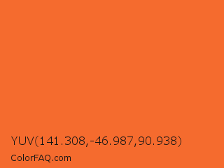 YUV 141.308,-46.987,90.938 Color is a normal orange color and the nearest color is Deep Carrot Orange #e9692c. Hex code #f56b2e and RGB value is rgb(245,107,46). In RGB color space, this color is composed of 96% red, 42% green, 18% blue, In CMYK color space, this color is composed of 0% cyan, 56% magenta, 81% yellow , 4% black , In HSL color space, this color has a hue angle of 18° , 91% saturation and 57% lightness.