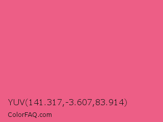 YUV 141.317,-3.607,83.914 Color is a light rose color and the nearest color is Dark Pink #e75480. Hex code #ed5e86 and RGB value is rgb(237,94,134). In RGB color space, this color is composed of 93% red, 37% green, 53% blue, In CMYK color space, this color is composed of 0% cyan, 60% magenta, 43% yellow , 7% black , In HSL color space, this color has a hue angle of 343° , 80% saturation and 65% lightness.