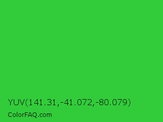 YUV 141.31,-41.072,-80.079 Color is a normal green color and the nearest color is Lime Green #32cd32. Hex code #32cc3a and RGB value is rgb(50,204,58). In RGB color space, this color is composed of 20% red, 80% green, 23% blue, In CMYK color space, this color is composed of 75% cyan, 0% magenta, 72% yellow , 20% black , In HSL color space, this color has a hue angle of 123° , 61% saturation and 50% lightness.