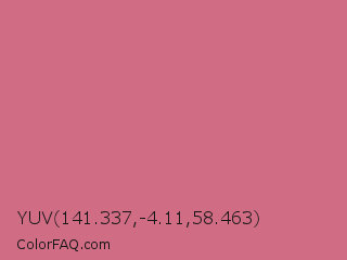 YUV 141.337,-4.11,58.463 Color is a light red color and the nearest color is Cinnamon Satin #cd607e. Hex code #d06d85 and RGB value is rgb(208,109,133). In RGB color space, this color is composed of 82% red, 43% green, 52% blue, In CMYK color space, this color is composed of 0% cyan, 48% magenta, 36% yellow , 18% black , In HSL color space, this color has a hue angle of 345° , 51% saturation and 62% lightness.