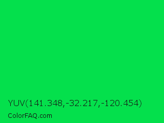 YUV 141.348,-32.217,-120.454 Color is a normal green color and the nearest color is Malachite #0bda51. Hex code #04e04c and RGB value is rgb(4,224,76). In RGB color space, this color is composed of 2% red, 88% green, 30% blue, In CMYK color space, this color is composed of 98% cyan, 0% magenta, 66% yellow , 12% black , In HSL color space, this color has a hue angle of 140° , 96% saturation and 45% lightness.