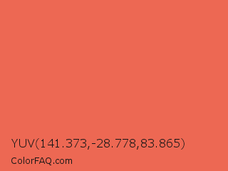 YUV 141.373,-28.778,83.865 Color is a light red color and the nearest color is Burnt Sienna #e97451. Hex code #ed6853 and RGB value is rgb(237,104,83). In RGB color space, this color is composed of 93% red, 41% green, 33% blue, In CMYK color space, this color is composed of 0% cyan, 56% magenta, 65% yellow , 7% black , In HSL color space, this color has a hue angle of 8° , 81% saturation and 63% lightness.