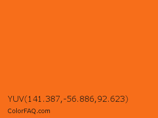 YUV 141.387,-56.886,92.623 Color is a normal orange color and the nearest color is Pumpkin #ff7518. Hex code #f76e1a and RGB value is rgb(247,110,26). In RGB color space, this color is composed of 97% red, 43% green, 10% blue, In CMYK color space, this color is composed of 0% cyan, 55% magenta, 89% yellow , 3% black , In HSL color space, this color has a hue angle of 23° , 93% saturation and 54% lightness.