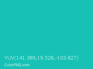 YUV 141.389,19.528,-103.827 Color is a normal cyan color and the nearest color is Tiffany Blue #0abab5. Hex code #17c2b5 and RGB value is rgb(23,194,181). In RGB color space, this color is composed of 9% red, 76% green, 71% blue, In CMYK color space, this color is composed of 88% cyan, 0% magenta, 7% yellow , 24% black , In HSL color space, this color has a hue angle of 175° , 79% saturation and 43% lightness.