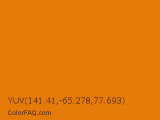 YUV 141.41,-65.278,77.693 Color is a normal orange color and the nearest color is Tahiti Gold #e97c07. Hex code #e67a09 and RGB value is rgb(230,122,9). In RGB color space, this color is composed of 90% red, 48% green, 4% blue, In CMYK color space, this color is composed of 0% cyan, 47% magenta, 96% yellow , 10% black , In HSL color space, this color has a hue angle of 31° , 92% saturation and 47% lightness.