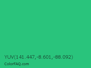 YUV 141.447,-8.601,-88.092 Color is a normal green color and the nearest color is Mountain Meadow #30ba8f. Hex code #29c47c and RGB value is rgb(41,196,124). In RGB color space, this color is composed of 16% red, 77% green, 49% blue, In CMYK color space, this color is composed of 79% cyan, 0% magenta, 37% yellow , 23% black , In HSL color space, this color has a hue angle of 152° , 65% saturation and 46% lightness.