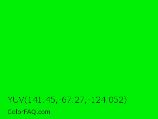 YUV 141.45,-67.27,-124.052 Color is a normal green color and the nearest color is Green #00ff00. Hex code #00f005 and RGB value is rgb(0,240,5). In RGB color space, this color is composed of 0% red, 94% green, 2% blue, In CMYK color space, this color is composed of 100% cyan, 0% magenta, 98% yellow , 6% black , In HSL color space, this color has a hue angle of 121° , 100% saturation and 47% lightness.