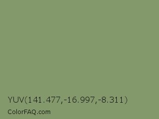 YUV 141.477,-16.997,-8.311 Color is a normal green color and the nearest color is Battleship Gray #828f72. Hex code #84996b and RGB value is rgb(132,153,107). In RGB color space, this color is composed of 52% red, 60% green, 42% blue, In CMYK color space, this color is composed of 14% cyan, 0% magenta, 30% yellow , 40% black , In HSL color space, this color has a hue angle of 87° , 18% saturation and 51% lightness.