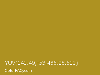 YUV 141.49,-53.486,28.511 Color is a normal yellow color and the nearest color is Alpine #af8f2c. Hex code #ae9221 and RGB value is rgb(174,146,33). In RGB color space, this color is composed of 68% red, 57% green, 13% blue, In CMYK color space, this color is composed of 0% cyan, 16% magenta, 81% yellow , 32% black , In HSL color space, this color has a hue angle of 48° , 68% saturation and 41% lightness.