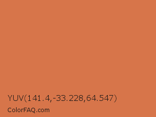 YUV 141.4,-33.228,64.547 Color is a normal orange color and the nearest color is Raw Sienna Crayola #d27d46. Hex code #d7754a and RGB value is rgb(215,117,74). In RGB color space, this color is composed of 84% red, 46% green, 29% blue, In CMYK color space, this color is composed of 0% cyan, 46% magenta, 66% yellow , 16% black , In HSL color space, this color has a hue angle of 18° , 64% saturation and 57% lightness.