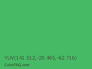 YUV 141.512,-20.465,-62.716 Color is a normal green color and the nearest color is Medium Sea Green #3cb371. Hex code #46ba64 and RGB value is rgb(70,186,100). In RGB color space, this color is composed of 27% red, 73% green, 39% blue, In CMYK color space, this color is composed of 62% cyan, 0% magenta, 46% yellow , 27% black , In HSL color space, this color has a hue angle of 136° , 46% saturation and 50% lightness.